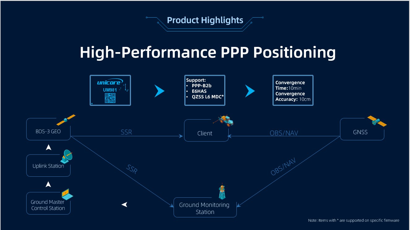 La serie UM981 supporta tutti i principali sistemi di navigazione e frequenze e può tracciare contemporaneamente i segnali da più sistemi, inclusi BDS B1I/B2I/B3I/B1C/B2a/B2b, GPS L1/L2/L5, GLONASS G1/G2/G3, Galileo E1/E5a/E5b/E6, QZSS L1/L2/L5/L6[1], NavIC L5 e SBAS. La serie di moduli supporta anche servizi aperti PPP (posizionamento preciso del punto), inclusi BDS-3 PPP-B2b, Galileo E6 ha e QZSS L6 MADOCA-PPP[2], Ottenere una precisione di posizionamento di 10 cm con un tempo di convergenza inferiore a 10 minuti. Le capacità migliorano in modo significativo la disponibilità dei dati del modulo in ambienti fortemente bloccati.