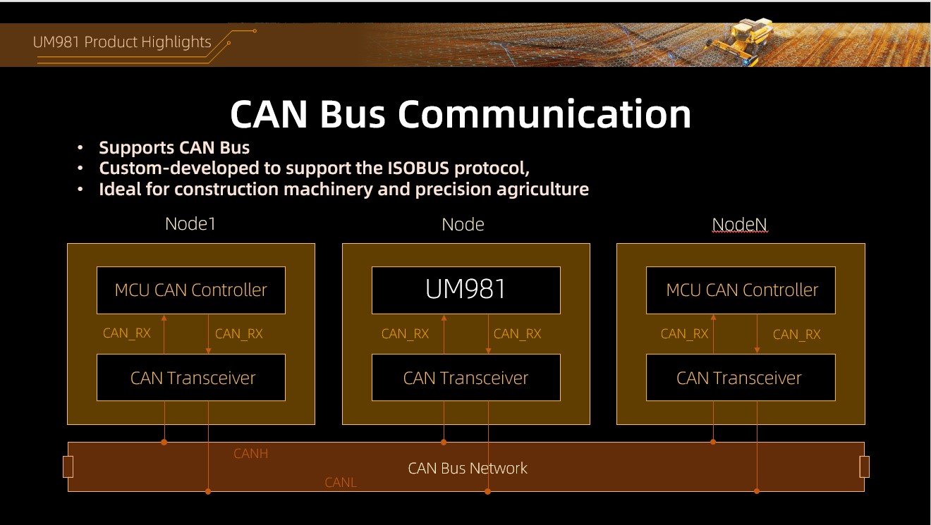 Progettato per una facile integrazione, UM981 supporta la comunicazione CAN Bus e può essere sviluppato su misura per supportare il protocollo ISOBUS in base alle esigenze degli utenti, eliminare la tradizionale necessità di passare da interfacce dati e protocolli nella comunicazione della porta seriale. Utilizzando la tecnologia CAN Bus, il modulo può elaborare input, decodifica e calcoli dei dati da vari sensori esterni, potenziando i sistemi di sterzo automatico delle macchine agricole.